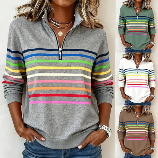 👚【S-5XL】Νέο γυναικείο τοπ φθινόπωρο-χειμώνας με πολύχρωμες ρίγες, σχέδιο με μισό φερμουάρ και όρθιο γιακά
