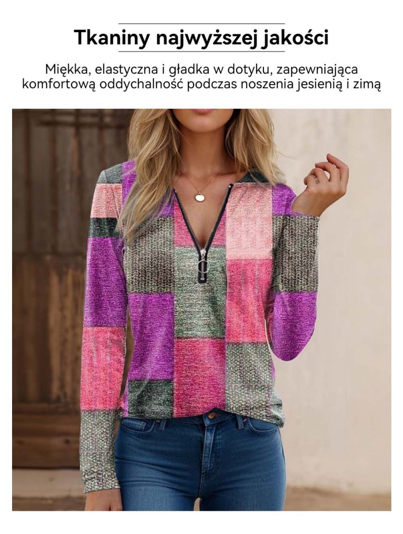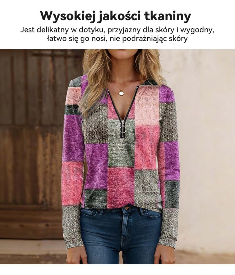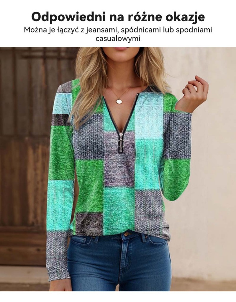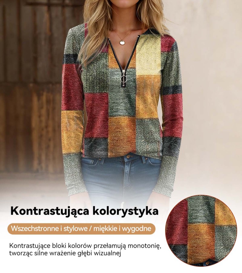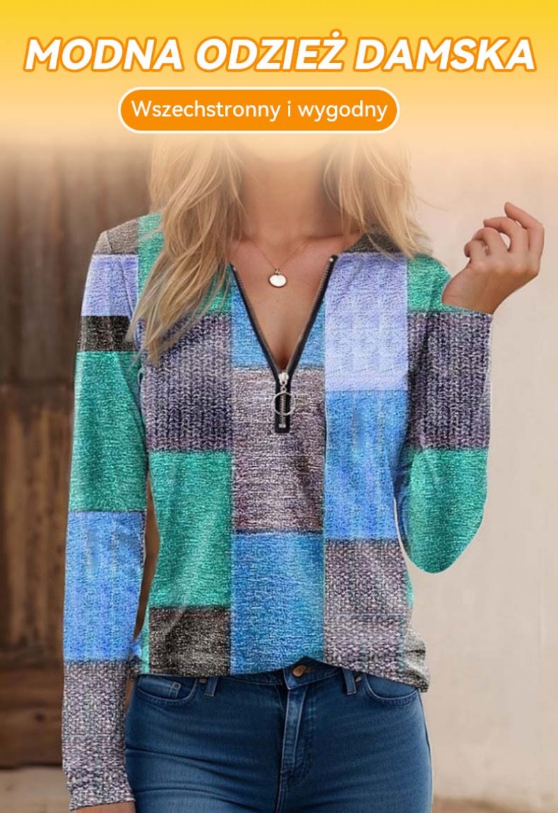 【S-5XL】Nowa modna, luźna, luźna koszulka z nadrukiem, dekoltem w serek, długim rękawem i blokami kolorów